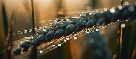 A close-up macro view captures the delicate beauty of wheat stalks glistening with dew drops at sunrise. The golden light of dawn illuminates the field, creating a warm and serene atmosphere. Sun rays filter through the stalks, casting long shadows and creating a soft bokeh effect in the background. The highlights the intricate details of the wheat heads and the tiny water droplets, evoking a sense of natural tranquility and the promise of harvest.