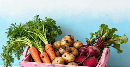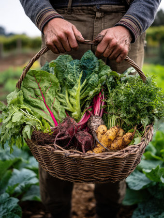 Farmer holding organic vegetable basket in soil-rich field, representing healthy lifestyle, ethical food, and authentic hands-on agricultural practices