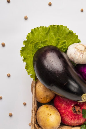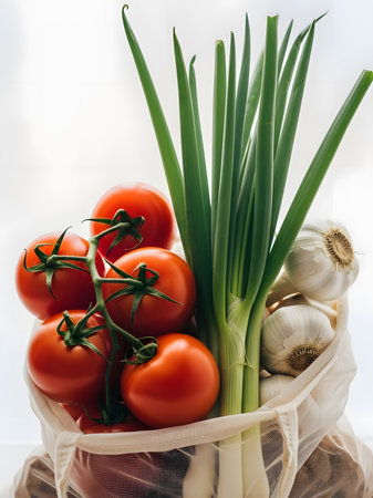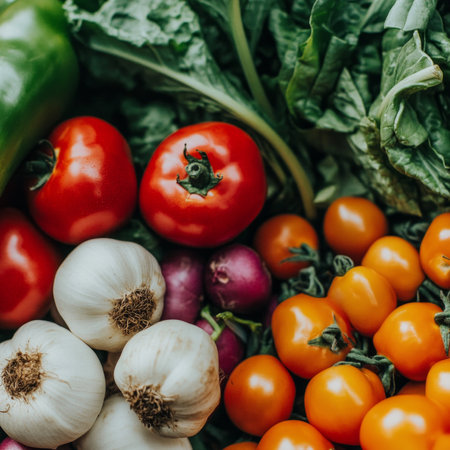 Fresh variety of colorful vegetables: tomatoes, garlic, bell peppers, spinach.