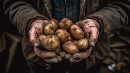 Farmer holding fresh harvested organic potatoes in his hands. Close up.