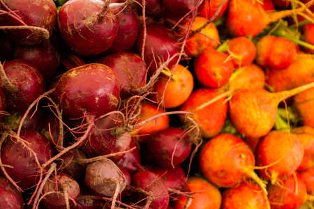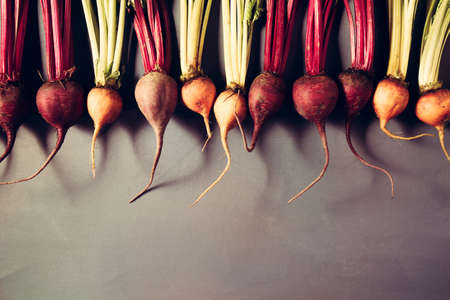 Mix of red and gold beets on grey background. Food background. Concept of healthy eating. Toned image. Horizontal