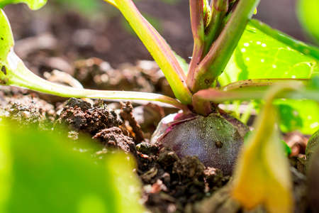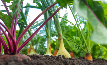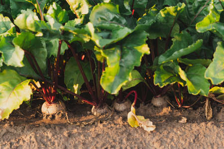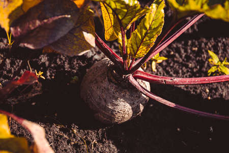 Fresh beets with leaves grow on bed. Autumn harvest is ready for harvest. natural food for vegetarians. Farm seasonal products