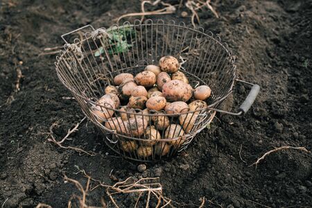 Harvesting potatoes in a wicker basket on vegetable garden.