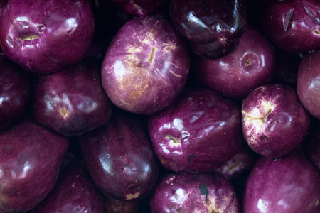 A pile of vegetables on a market stall. Beautiful ripe tomatoes and radishes. Close up photo with shallow focus.
