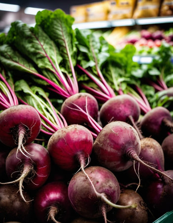 Beets is arranged in supermarket produce section, showcasing their rich colors and inviting shoppers for selection. Seasonal vegetable offers freshness and quality. Generative AI.