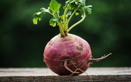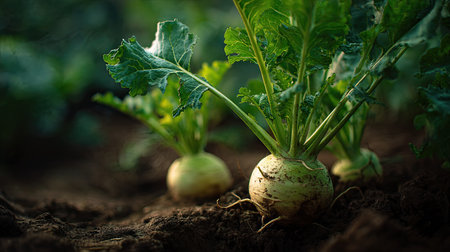 Rutabaga with small fresh leaves, growing upright in fertile soil, sunlight filtering gently, realistic textures, vibrant green tones, natural photography style, wide balanced composition for timelapse video.
