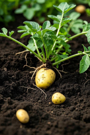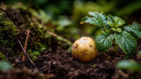Freshly Harvested Potato Nestled in Earthy Soil with Vibrant Greenery