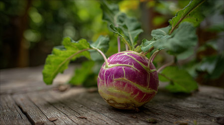Fresh and Vibrant Kohlrabi with Green Leaves Resting on Rustic Wood Surface