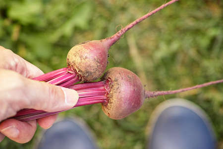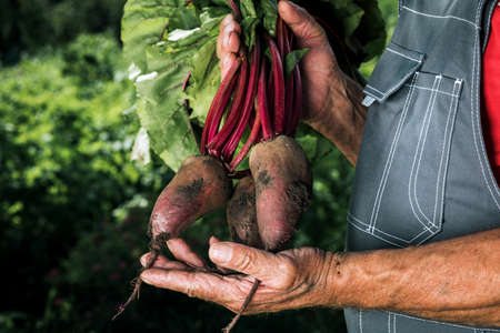 Farmer holding fresh beet. Vegetables harvest. Organic fresh harvested vegetables