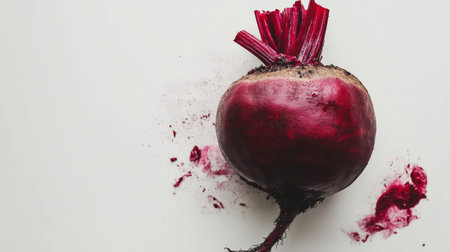 A fresh beetroot rests on a white surface, showcasing its deep red hue and earthy texture. The greens are partially visible, emphasizing its natural state and freshness.