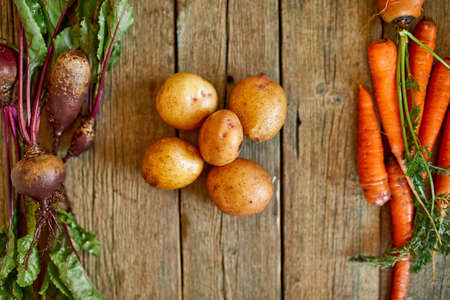 Flat lay of assortment of fresh root vegetables, bio healthy, organic food