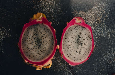 Pair of beetroots on dark background. Black wooden desk table surface.