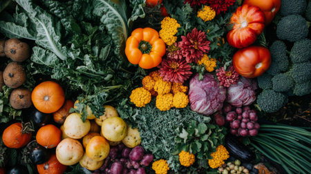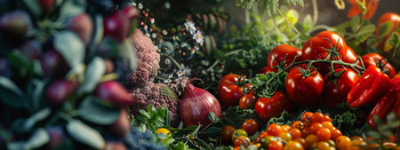 A vibrant and colorful display of fresh vegetables, including tomatoes, onions, and cauliflower, surrounded by greenery and small flowers. The natural lighting and rich textures emphasize the freshness and organic quality, perfect for themes related to healthy eating, gardening, and farm-to-table.
