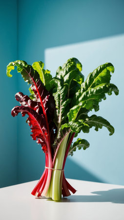 AI Generated. Bunch of Fresh Red and Green Chard Leaves on Blue Background