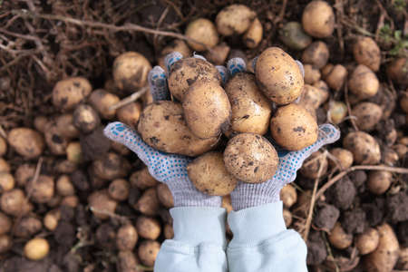 Potatoes in the hands. Harvesting potatoes. A new crop of potatoes. Autumn work on the farm. Organic farming. Top view.