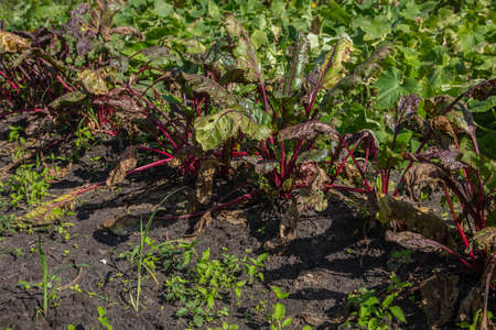 Sea beet, Beta vulgaris subsp. maritima, beetroot, table, garden, red, or golden beet, beet greens are green leaves with purple veins growing from a root crop in the ground. Beets in the garden. Good harvest beets.