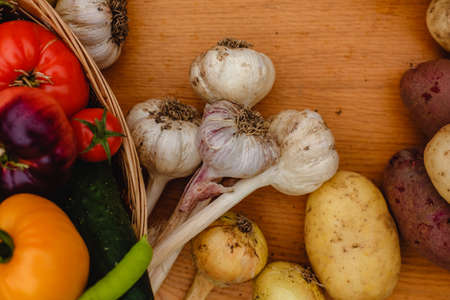 Harvest vegetables on the ground. Potatoes, carrots, beets, peppers, tomatoes, cucumbers, beans, pumpkin, onions and garlic. Autumn harvest farmers