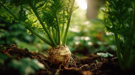 The Maca root in spring, fresh green leaves, soft sunlight filtering, vibrant atmosphere full of vitality, natural textures, serene mood.