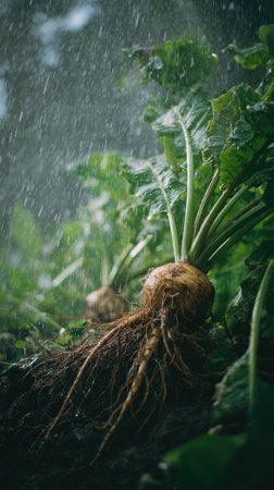 Maca root in a storm, heavy rain pouring down, strong winds twisting their leaves, natural.