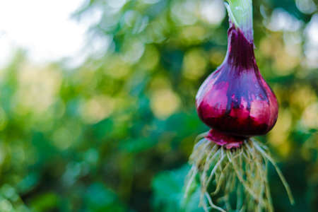 A close up view of a raw organic red beet covered in fresh water droplets and soil particles held up against a blurred green garden background during harvest season.