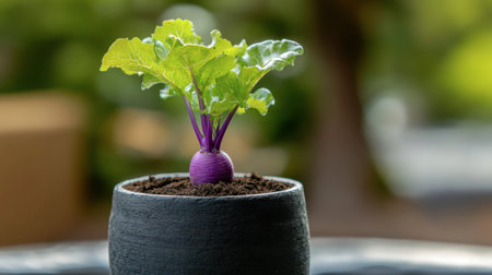 A turnip top with purple stem growing from moist soil in a designer planter.
