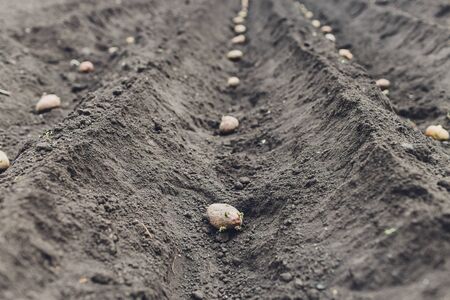 process of planting potato field in the vegetable garden, close up. Seed potatoes.