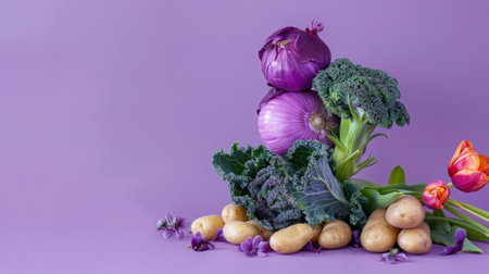 Fresh vegetables arrangement on a purple background, featuring onions, broccoli, potatoes, and colorful tulips
