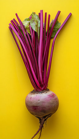 Single Beetroot on Vibrant Yellow Background, Showcasing Rich Red Stalks and Green Leaves.