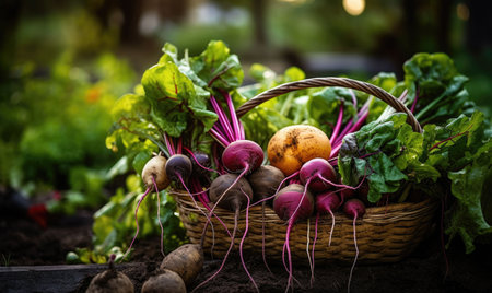 An AI generated illustration of a basket filled with freshly harvested radishes in a lush green lawn