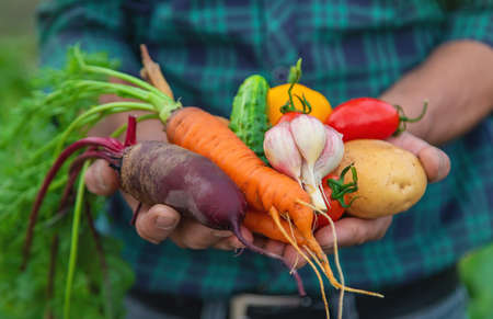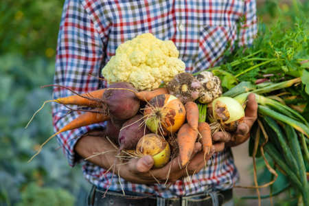 A man farmer holds vegetables in his hands in the garden. Selective focus. Food.