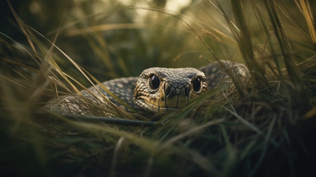 This close-up image captures a colorful snake resting among lush greenery, highlighting its intricate patterns and vibrant colors, showcasing the beauty of nature.