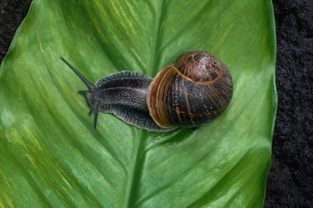 Detail of beige Giant African Land snail against blurred natural background. Selective focus