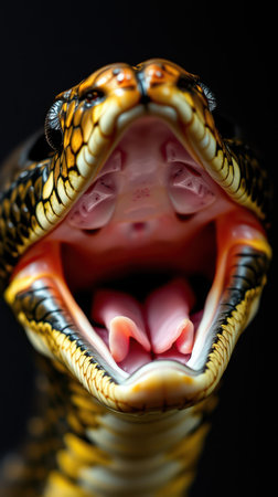 Close-up of a vibrant snake with mouth open showcasing striking details and colors in its habitat