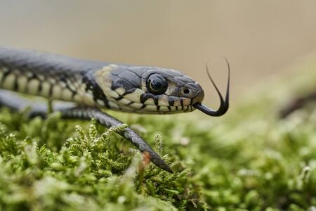 Natrix is a non-venomous species of snake, a long and black reptile, a man holding a snake.