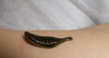 Traditional alternative medicine - doctor doing procedure of hirudotherapy for young woman.