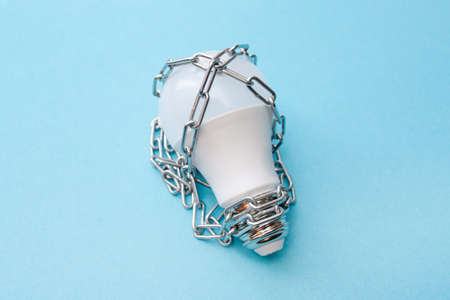 LED light bulb wrapped in a metal chain. The concept of energy shortages and rising prices. blue background. top view. flat lay.