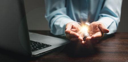 Hand of woman with light bulb and there is gear icon and using laptop computer. Idea of ​​inspiration from online technology. Innovation idea concept. Concept of brainstorming inspiration creatively.