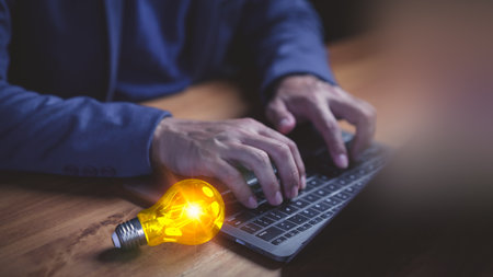 Creative business concept with glowing yellow light bulb beside laptop as hands typing, symbolizing innovation, new ideas, inspiration, brainstorming, and technology-driven creativity in modern work.