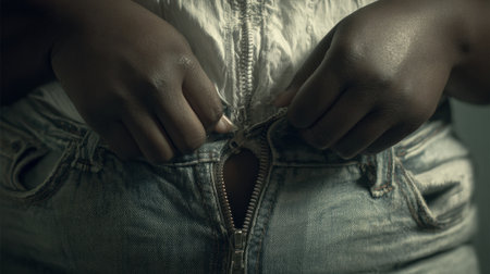A woman is attempting to zip up her jeans, showing determination in an indoor setting with soft lighting and neutral colors.