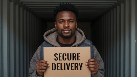 Man holding a cardboard box with the words SECURE DELIVERY printed in bold letters, standing inside a shipping container. Concept of reliable and safe logistics.
