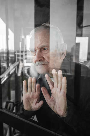 lonely old man looks out of the window, waiting. The concept of loneliness, old age, pandemic problems, lack of communication. Quarantine isolation