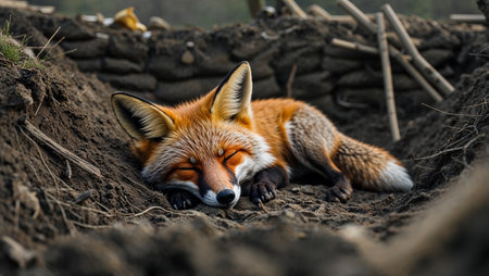 Wild red fox resting in its burrow, enjoying a peaceful moment in nature. Ai generated image