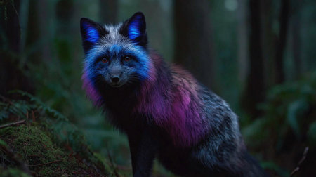 A fox stands in a dark forest, glowing with blue and purple light among trees and plants during night.