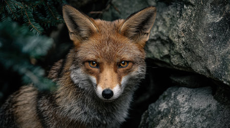 This stunning close-up portrait captures the intense gaze of a fox nestled among rocks in its natural habitat. The detailed fur and alert expression highlight the beauty of wildlife.