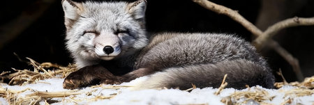 A sleepy red fox curled up in a cozy den, its bushy tail wrapped around its body as it naps peacefully.