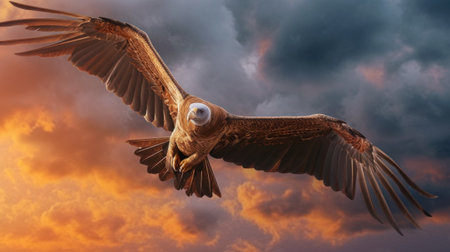 Griffon vulture flying over dramatic sunset sky - 3D render