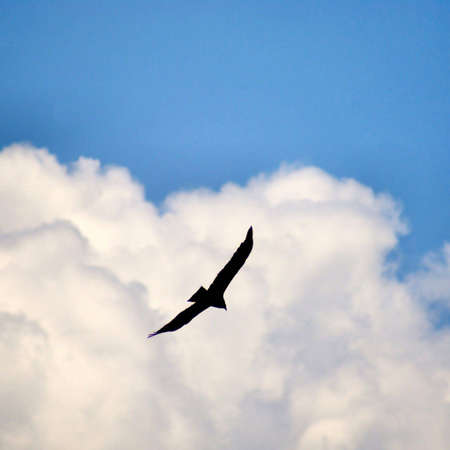 A large and majestic bird is soaring high and freely through a vivid, colorful, cloudy blue sky up above us