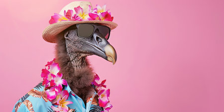 Fashionable vulture wearing hat and sunglasses on pink background.