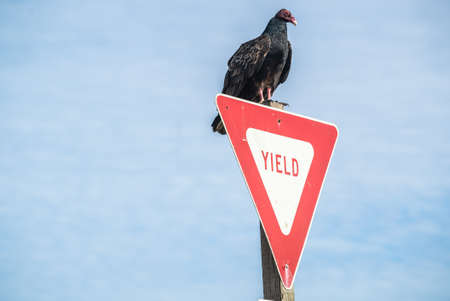 Turkey Vulture Buzzard Condor ready to take flight. Sitting on a Yield Sign. California Pacific Ocean USA
