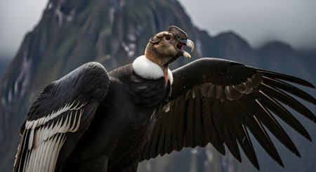 A majestic Andean condor with a white collar and impressive caruncle spreads its massive wings in a powerful display against a backdrop of the misty Andes mountains. The image captures the raw power and grandeur of this iconic bird.